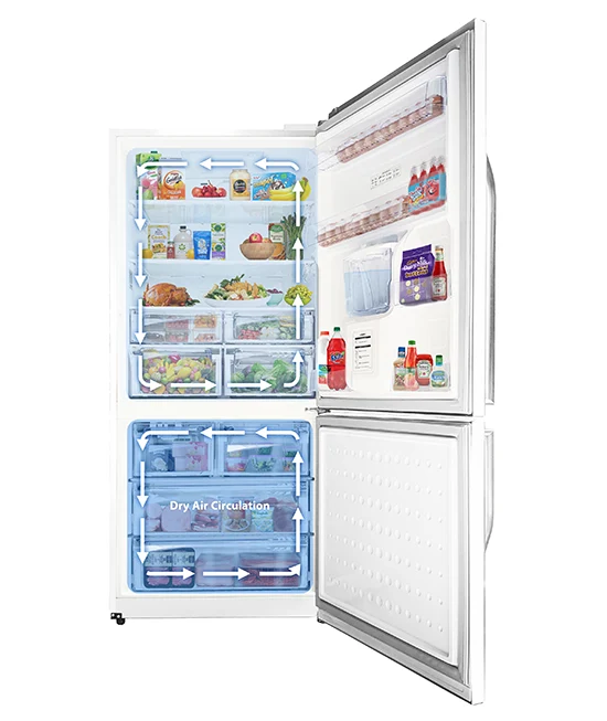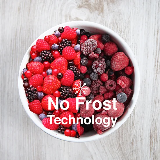 فناوری No Frost با سیستم گردش هوای خشک، رطوبت موجود در محفظه‌ها را از بین می‌برد و از تشکیل برفک روی مواد غذایی جلوگیری می‌کند.