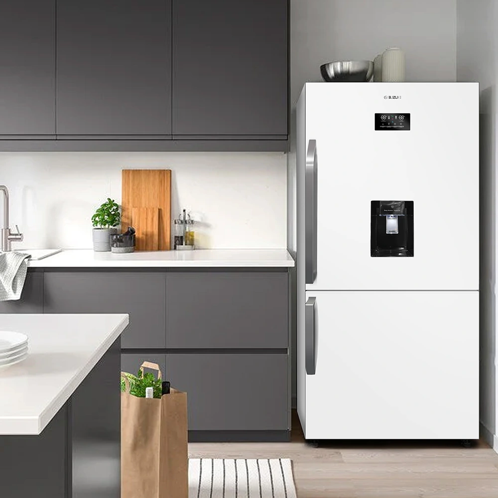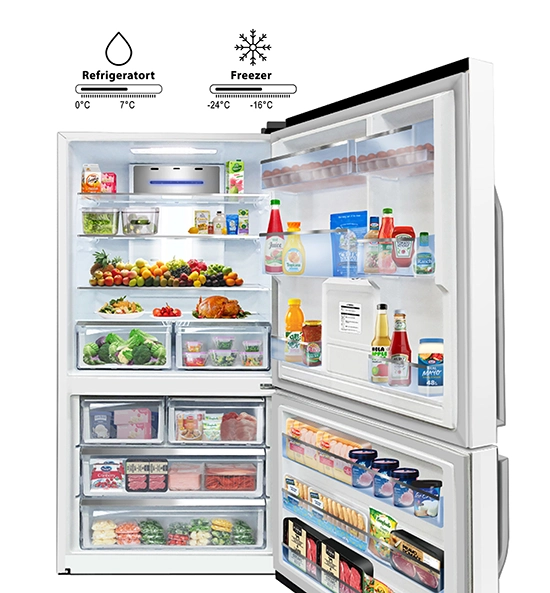 این یخچال با رده انرژی A دارای پنل کنترل لمسی دیجیتال است که به شما امکان میدهد دمای یخچال و فریزر و سایر قابلیتها را تنظیم کنید.
